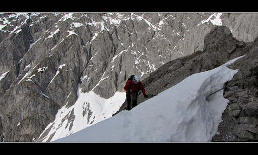 In den Rinnen und Kaminen hat sich doch schon sehr viel Schnee gesammelt, so dass wir streckenweise etwas abseits der Seilführung „kämpfen“ mussten: